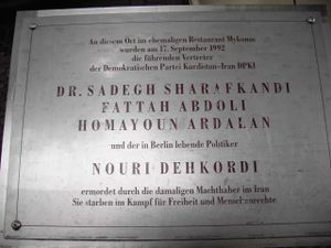 قبور فتاح عبدولي، صادق شرفكندي وهمايون أردلان، الضحايا الثلاث بحادث اغتيال ميكونوس، في Père Lachaise Cemetery (باريس).