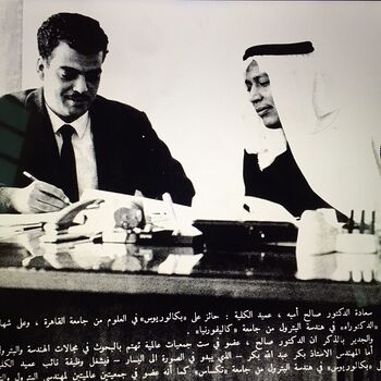 صالح أمبا، يمين الصورة، وإلى اليسار خليفته في رئاسة جامعة البترول والمعادن، الدكتور بكر عبد الله بكر.