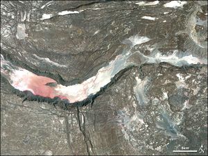 Infrared-enhanced satellite image of a graben in the Afar Depression.