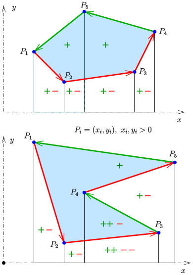 In case of the number is negative, otherwise positive or if . In the diagram the orientation of an edge is shown by an arrow. The color shows the sign of : red means , green indicates . In the first case the trapezoid is called negative in the second case positive. The negative trapezoids delete those parts of positive trapezoids, which are outside the polygon. In case of a convex polygon (in the diagram the upper example) this is obvious: The polygon area is the sum of the areas of the positive trapezoids (green edges) minus the areas of the negative trapezoids (red edges). In the non convex case one has to consider the situation more carefully (see diagram). In any case the result is