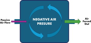 Negative pressure is generated and maintained in a room by a ventilation system that continually attempts to move air out of the room. Replacement air is allowed into the room through a gap under the door (typically about one half-inch high). Except for this gap, the room is as airtight as possible, allowing little air in through cracks and gaps, such as those around windows, light fixtures and electrical outlets. Leakage from these sources can make it more difficult and less energy efficient to maintain room negative pressure.[1]