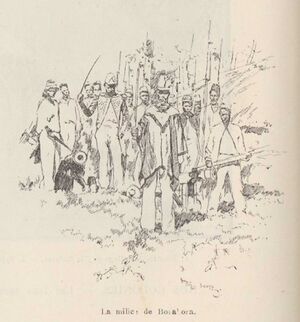 Bora Bora and its dependencies were nominally annexed on 19 March 1888 by Governor Lacascade.[19] Traditionally, Boraborans were regarded as the most warlike people of the archipelago.[14] LMS missionary William Edward Richards wrote in 1888 that the Boraborans "were strongly opposed to the [French] flag, and it was feared that blood would be shed" but that they wisely appreciated their weakness and lack of "mountain strongholds", and "gradually settl[ed] down with bad grace into the inevitable". The islands were also recovering from a recent civil war between Bora Bora and secessionist forces in Maupiti in 1876.[24][23] Toullelan noted that Bora Bora did not lay down its arms until 1894 but provided no details.[41]