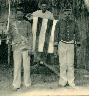In 1880, King Tahitoe accepted the provisional protectorate by Chessé and raised the protectorate flag of Raiatea with the French tricolour on its canton. Captain Mervyn B. Medlycott of the corvette HMS Turquoise ordered French Lieutenant Félix Marie Salaun de Kertanguy, of the war schooner Orohéna, to lower the protectorate flag, and in its place the Raiatean flag was hoisted and accorded a royal salute. According to Guy Hardy Scholefield, "The French flag was permitted to be rehoisted provisionally on 25 May 1881, for periods of six months, the discussion being renewed from time to time."[27] Tahitoe was deposed by his subjects for requesting the protectorate. His daughter and successor, Queen Tehauroa, unsuccessfully attempted to enlist the protection of the British to preserve Raiatea's independence in accordance with the Jarnac Convention.[24] On 17 March 1888, Governor Lacascade took possession of Raiatea and Tahaa and raised the French flag.[29][28]