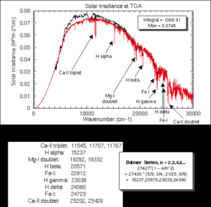 Solar irradiance spectrum at top of atmosphere, on a linear scale and plotted against wavenumber