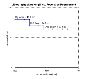 تطور طول موجة الطباعة الضوئية المناظرة لمختلف المصادر الضوئية. يجدر ذكر أن نفس مصدر الضوء قد يـُستعمل لعدة أجيال تكنولوجية.