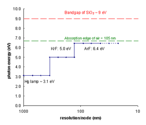 Changing the lithography wavelength is significantly limited by absorption. Air absorbs below ~ 185 nm.