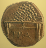 The Turkish name of the city is Trabzon. It is historically known in English as Trebizond. In Latin, Trabzon was called Trapezus, which is the latinization of the Ancient Greek Τραπεζοῦς (Trapezous), the first name of the city. (τράπεζα meant "table" in Ancient Greek; note the table on the coin in the figure.) Both in اليونانية الپنطية واليونانية الحديثة، تـُدعى Τραπεζούντα (Trapezounta). In Ottoman Turkish and Persian, it is written as طربزون. During Ottoman times, Tara Bozan was also used.[5][6][7][8] Some western geographers used this name instead of the Latin Trebizond. In Laz it is known as ტამტრა (T'amt'ra) or T'rap'uzani,[9] in Georgian it is ტრაპიზონი (T'rap'izoni) and in Armenian it is Տրապիզոն Trapizon. The 19th-century Armenian travelling priest Byjiskian called the city by other, native names, including Hurşidabat and Ozinis.[10] Other versions of the name, which have incidentally been used in English literature as well, include: Trebizonde (بالفرنسية)، Trapezunt (Ge.), Trebisonda (Sp.), Trapesunta (It.),Trapisonda, Tribisonde, Terabesoun, Trabesun, Trabuzan, Trabizond و Tarabossan.