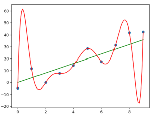 Figure 2.  Noisy (roughly linear) data is fitted to a linear function and a polynomial function. Although the polynomial function is a perfect fit, the linear function can be expected to generalize better: If the two functions were used to extrapolate beyond the fitted data, the linear function should make better predictions.