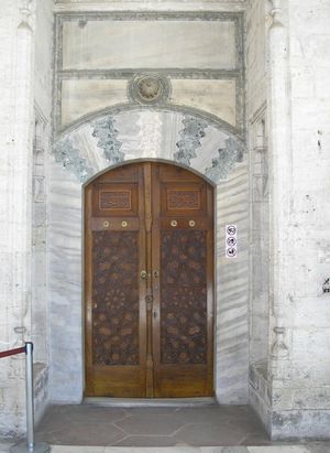 Main entrance to the Audience Chamber, with the small fountain of Suleiman I to the right, and the large gifts window to the left