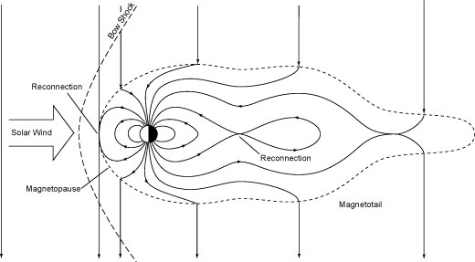 وترتبط كثيرٌ من العواصف المغنطيسية بثقوب الإكليل الشمسي وهي مناطق ذات كثافة منخفضة في إكليل الشمس. وينشأ عن الشمس تيارٌ متواصلٌ من الجسيمات الدقيقة ذات الشحنة الكهربائية يُسمى الرياح الشمسية. وينشأ هذا التيار بصفة رئيسية من ثقوب الإكليل الشمسي. وتظهر تيارات عالية السرعة من الرياح الشمسية كلما زاد النشاط الشمسي. وعندما تصطدم الجسيمات المتحركة بسرعة والمكونة لهذه التيارات، بالمجال المغنطيسي للأرض، فإن المجال المغنطيسي يصد بعض هذه الجسيمات. وتنتج عاصفة مغنطيسية عن هذا التفاعل بين تلك الجُسيمات والمجال المغنطيسي للأرض.