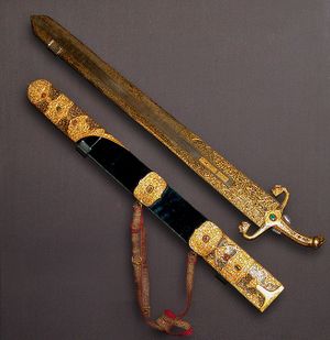 ترك عُثمان ورائه سيفه الخاص الذي اشتهر باسم «سيف عُثمان» (بالتُركيَّة العُثمانيَّة: تقليدى سيف؛ وبالتُركيَّة المُعاصرة: Osman Kılıcı)،[ِ 25] فورثه عنه ابنه أورخان، ثُمَّ حفيده مُراد، واستمرَّ السلاطين من بعده يتناقلوه، حتَّى أصبح تقليد هذا السيف يُمثِّلُ الجُزء الأبرز في حفل تتويج السلاطين ومُبايعتهم بالخِلافة الإسلاميَّة، وأصبح يرمز إلى انتقال مُلك آل عُثمان من سُلطانٍ إلى آخر.[ِ 26] تُشيرُ المراجع إلى أنَّ عُثمانًا قُلِّد هذا السيف من قِبل مُعلِّمه وحميه الشيخ «إده بالي» لِيكون «سيف الإسلام المسلول على الكُفَّار»، وتولَّى شيخ الدراويش المولويَّة في قونية، وكان بمثابة الإمام الأكبر حينها؛ تزنير عُثمان بالسيف وحزامه.[68] كان السلاطين العُثمانيّون يتقلَّدون السيف بعد حوالي أُسبوعين من تربُّعهم على العرش، وكان حفل التقليد هذا أقرب ما يكون إلى احتفالات التتويج الملكيَّة والإمبراطوريَّة في أوروپَّا الغربيَّة، وكان يتم في جامع أبي أيُّوب الأنصاري بالآستانة. أمَّا من كان يُقلِّد السُلطان سيف عُثمان فكان غالبًا شيخ الإسلام أو شريف قونية، والأخير كان شيخ الدراويش المولويَّة الذي كان يُستدعى إلى الآستانة خصيصًا لِهذا الغرض.[ِ 27]