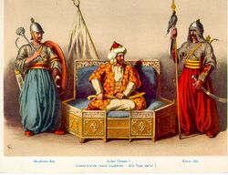رسمٌ لِعُثمان الأوَّل منقول عن مُنمنمة عُثمانيَّة يبدو فيه وهو بِملابس العصر الكلاسيكي للسلطنة، وهو أمرٌ يُنافي الواقع إذ أنَّ لباسه كان أقرب إلى لباس المُتصوفين والدراويش.
