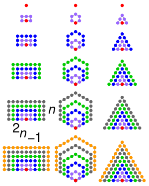 Proof without words that a hexagonal number (middle column) can be rearranged as rectangular and odd-sided triangular numbers