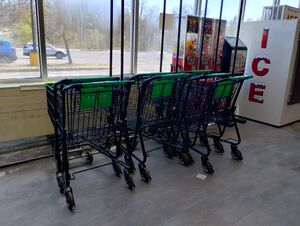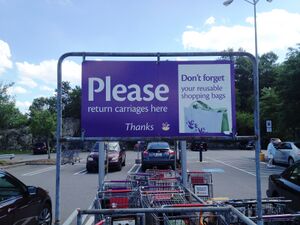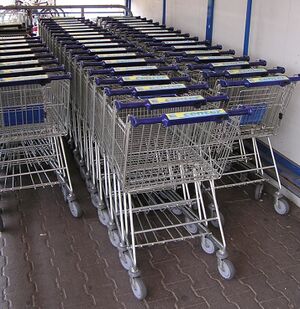 Electronic systems are sometimes used by retailers. Each shopping cart is fitted with an electronic locking wheel clamp, or "boot".[39] A transmitter with a thin wire is placed around the perimeter of the parking lot, and the boot locks when the cart leaves the designated area. Store personnel must then deactivate the lock with a handheld remote control to return the cart to stock. Often, a line is painted in front of the broadcast range to warn customers that their cart will stop when rolled past the line. However, these systems are very expensive to install and although helpful, are not foolproof. The wheels can be lifted over the electronic barrier and/or pushed hard enough that the locks break.[37][40] There are also safety concerns if the person pushing the trolley is running, and also if the trolley doesn't lock and is taken onto a road, locking due to magnetic materials under the road. Some cities have required retailers to install locking wheel systems on their shopping carts. In some cases, electronic systems companies have encouraged passage of such laws to create a captive audience of potential customers.[41]