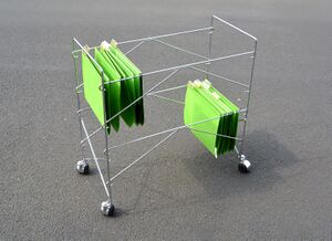 Shopping cart manufacturers such as Caddie, Wanzl, or Brüder Siegel maintained intensive direct and indirect mutual business relations with artists, graphic designers, industrial and furniture designers such as Charles Eames, Harry Bertoia, or Verner Panton since the market launch of the shopping cart - not only for new and further developments of their own shopping carts and wire basket goods, but also for advertising and PR purposes. Olivier Mourgue,[47] Otl Aicher, Stiletto[48] as well as other artists and designers had wire furniture or artwork made by shopping cart manufacturers.[49]