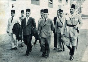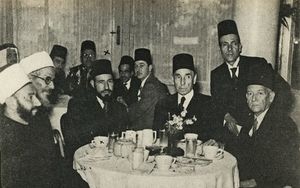 شخصيات سياسية ودينية في استقبال محمد علي الطاهر بفندق كونتيننتال بالقاهرة. من اليسار إلى اليمين: الشيخ محمد صبري الدين من الخليل، الشيخ ابراهيم اطفيش من الجزائر، المرشد العام للإخوان المسلمين حسن البنا، رئيس أركان الجيش المصري عزيز پاشا المصري، الصحفي المصري الفلسطيني محمد علي الطاهر والوزير المصري عبد الرحمن الرافعي.