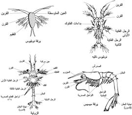 • البنيدات Penaeidea وتزود أرجلها الثلاثة الأولى بملاقط، لكن الملقط الثالث أصغر من الملقطين الأول والثاني. يصل طول بعضها في المناطق الاستوائية إلى 30سم، ولا تحمل الإناث بيوضها؛ بل تلقيها في ماء البحر. من أجناسها المعروفة القريدس الشائع Penaeus (الشكل 3) الذي تفقس بيوضه لتعطي يرقة تسمى نوبليوس nauplius تنسلخ مرات عدة لتعطي يرقة أخرى تسمى نوبليوس تالية metanauplius ثم زوئية zoea ثم مايسيس mysis التي تتحول إلى حيوان بالغ (شكل 4).