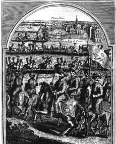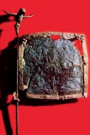 According to Herodotus (9.59), each Persian army division had its own standard, and "all officers had banners over their tents" (Xenophon, 8.5.13). One such banner, a square plaque in saltire, is depicted on a Greek vase, the so-called "Douris cup" held by the Louvre.[15] A similar design is known from an Urartian bronze disk from Altıntepe.[16] Similar square plaques on poles are known from six of the audience scenes of the Throne Hall relief at Persepolis.[17] The Alexander Mosaic of Pompeii, a Roman-era copy of a Hellenistic painting dated c. 320 BCE, also shows the royal Persian standard.,[18] depicted as a rectangular plaque, possibly originally in purple, with a dark red border with yellow dots. In the field, a golden bird is only partially preserved. The "royal falcon" of Persia (varəγna) represented farr or "glory", while the eagle was associated with the Achaemenid dynasty itself.[19]