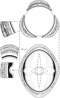 يحدد المخطط الطلعي كل صفات الحبة من: أبعاد وأنماط تزينات الإكزين والفتحات. ويحوي النقاط الآتية: الشكل (5) رسم كلي لمنظور الحبة وآخر بالتكبير الشديد لجزء من الغلاف. يحدد الرسم الإجمالي بالتكبير الضعيف شكل الحبة وصفات فتحاتها، في حين توضح الأشكال الجانبية المشهد بالتكبير الشديد حيث يظهر التوضع الطبقي stratification لجزء من الغلاف في ثلاثة مواضع.