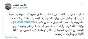 وكتب البخيتي المقيم بلندن في تغريدة: "تلقيت في رسالة على الخاص -وفي تغريدة- دعوة رسمية لزيارة إسرائيل من وزارة الخارجية الإسرائيلية عبر المتحدث بالعربية باسمها الصديق حسن كعبية، وقبلت الدعوة، وأبلغت صديقي أن هدفي هو زيارة اليهود اليمنيين الذين هجرهم نظام الإمامة في اليمن، وتبادلنا الأرقام وجاري الترتيب".