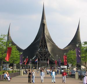 The 1970s saw the Indonesian government promote indigenous Indonesian forms. Constructed in 1975, the Taman Mini Indonesia Indah theme park re-created over twenty buildings of exaggerated proportions to showcase Indonesian traditional vernacular forms. The government also called for Indonesian architects to design an Indonesian architecture, and by the 1980s in particular, most public buildings were built with exaggerated elements of traditional vernacular forms. These works includes the large concrete Minangkabau style roofs on government buildings in the city of Padang, the giant Javanese joglo structures at the University of Gadjah Mada, and also the Javanese-Balinese meru multi-tiered roofs of rectorate tower in University of Indonesia.