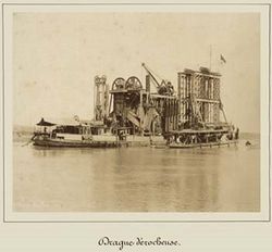 وفى 25 أبريل 1859 أقيم حفل صغير ببورسعيد للبدء فى الحفر، فكانت ضربة المعول الأولى لديليسبس، وكان معه مائة عامل حضروا من دمياط، وتوقف الحفر بسبب اعتراضات الباب العالى وإنجلترا، إلى أن بدأ مرة أخرى فى ٣٠ نوفمبر إثر وساطة قامت بها الإمبراطورة أوجينى لدى الباب العالى وإنجلترا، فعاود العمال الحفر وكان عددهم قد بلغ 330 عاملاً، و٨٠ عاملاً أجنبياً، ثم تم الاستعانة بالعمال المصريين فقط، فبلغ عددهم 1700 عامل.