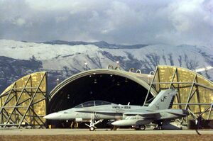 Twelve NATO countries provided forces to Operation Deny Flight: Belgium, Canada, Denmark, France, Germany, Italy, the Netherlands, Norway, Spain, Turkey, the United Kingdom and the United States. Together, these twelve states contributed a total of 4,500 personnel who were based at air bases in five countries: France, Germany, Greece, Italy, and the United Kingdom and on aircraft carriers in the region.[15] Eight of the participating countries contributed a total of 239 aircraft to the operation, of which nearly half, 108, came from the United States.[15] Within the United States, the US Navy and US Marine Corps provided the most support for the operation, and together they flew 70% of all of the air defense sorties flown during Deny Flight.[21] American aircraft also provided the majority of the airstrikes during the conflict; of the 1,150 bombs dropped by NATO forces, 88% came from American aircraft.[21]