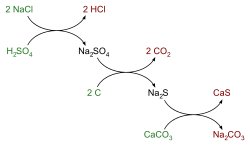 Reaction scheme of the Leblanc process (green = reactants, black = intermediates, red = products)