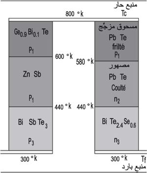 للحصول على مردود أعظمي للمزدوجة الكهرحرارية يُستحسن استخدام أكثر من مزدوجة كهرحرارية، إذ يمكن أن تتمتع مزدوجة كهرحرارية بمعامل جدارة أعلى من غيرها ضمن مجال محدَّد من درجات الحرارة، في حين تتصف أخرى بخصائص كهرحرارية أفضل في درجات حرارة أعلى أو أخفض، فعلى سبيل المثال يمكن الحصول على مولد كهرحراري مؤلَّف من شرائح كالمبيَّن في الشكل (2) يصل بين منبع حار درجة حرارته (530 ْس) ومنبع بارد درجة حـرارتـه (30 ْس) ويشتمل على عمودين يتألف كل منهما من ثلاث مواد مختلفة. كما يمكن تجميع أبيال كهرحرارية كهذه على التسلسل لزيادة الجهد الكهربائي الناتج، أو على التفرع لزيادة التيار المتولِّد.