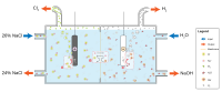 يتم تقسيم خلية التحليل الكهربي إلى قسمين عن طريق غشاء يعمل كمبادل أيوبي. يتم وضع محلول كلوريد الصوديوم المشبع في قسم الأنود، بينما الماء المقطر يوضع في قسم الكاثود.