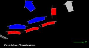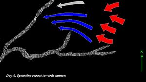 وبدأت المرحلة النهائية من المعركة عندما اندحر القسم الأكبر من القوات البيزنطية بإتجاه الجرف تحت تأثير القتاك من جهة الأمام، بينما كانوا يتراجعون بإتجاه المركز نتيجة الهجوم من الجانب، حيث نجم عن ذلك إختلال التوازن في الجيش.