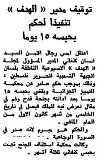 غسان كنفاني (عكا 8 أبريل 1936 - بيروت 8 يوليو 1972) روائي وقاص وصحفي فلسطيني تم اغتياله على يد جهاز المخابرات الإسرائيلية (الموساد) في 8 يوليو 1972 عندما كان عمره 36 عاما بتفجير سيارته في منطقة الحازمية قرب بيروت. كتب بشكل أساسي بمواضيع التحرر الفلسطيني، وهو عضو المكتب السياسي الجبهة الشعبية لتحرير فلسطين. في عام 1948 أجبر وعائلته على النزوح فعاش في سوريا ثم في لبنان حيث حصل على الجنسية اللبنانية. أكمل دراسته الثانوية في دمشق وحصل على شهادة البكالوريا السورية عام 1952. في ذات العام تسجّل في كلية الأدب العربي في جامعة دمشق ولكنه انقطع عن الدراسة في نهاية السنة الثانية، انضم إلى حركة القوميين العرب التي ضمه إليها جورج حبش لدى لقائهما عام 1953. ذهب إلى الكويت حيث عمل في التدريس الابتدائي، ثم انتقل إلى بيروت للعمل في مجلة الحرية (1961) التي كانت تنطق باسم الحركة مسؤولا عن القسم الثقافي فيها، ثم أصبح رئيس تحرير جريدة (المحرر) اللبنانية، وأصدر فيها(ملحق فلسطين) ثم انتقل للعمل في جريدة الأنوار اللبنانية وحين تأسست الجبهة الشعبية لتحرير فلسطين عام 1967 قام بتأسيس مجلة ناطقة باسمها حملت اسم "مجلة الهدف" وترأس غسان تحريرها، كما أصبح ناطقا رسميا باسم الجبهة الشعبية لتحرير فلسطين. تزوج من سيدة دانماركية (آن) ورزق منها ولدان هما فايز وليلى. أصيب مبكرا بمرض السكري. بعد استشهاده، استلم بسام أبو شريف تحرير المجلة.