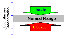 يعمل الإنسولين على تحفيز خلايا الجسم على استخدام الگلوكوز الموجود في مجرى الدم، وبذلك يشكل هو والگلوكاكون جزءً من نظام رد الفعل المحافظ على توازن كميات السكر في الدم.