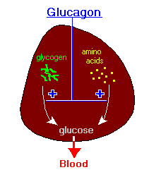 وبمجرد نفاذ مخازن الگلايكوجين في الكبد، يعمل الگلوكاگون على تشجيع الكبد والكلى على تخليق الگلوكوز بعملية تدعى استحداث الگلوكوز.