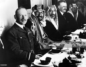 من اليسار إلى اليمين: السير بروك پوپم، سلاح الطيران الملكي؛ الملك عبد العزيز؛ والملك فيصل الأول؛ السير فرانسس هنري همفريز، المندوب السامي البريطاني في العراق، على متن السفينة الحربية البريطانية لوپن HMS Lupin، في الخليج العربي، في 22 فبراير 1930.