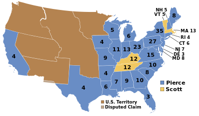 Pierce was born in New Hampshire. He served in the U.S. House of Representatives from 1833 until his election to the Senate, where he served from 1837 until his resignation in 1842. His private law practice was a success, and he was appointed New Hampshire's U.S. Attorney in 1845. He took part in the Mexican–American War as a brigadier general in the Army. Democrats saw him as a compromise candidate uniting Northern and Southern interests, and nominated him for president on the 49th ballot at the 1852 Democratic National Convention. He and running mate William R. King easily defeated the Whig Party ticket of Winfield Scott and William A. Graham in the 1852 presidential election.