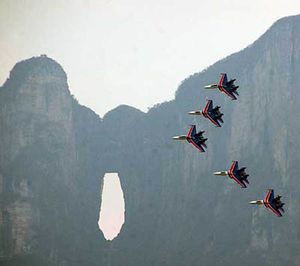 خمس طائرات سوخوي 27 يتدربون استعداداً لاستعراض جوي في متنزه الغابة الوطنية في ژانگجياجيه، في مقاطعة هونان بوسط الصين، يوم الخميس 16 مارس 2006. وقد قاموا في اليوم التالي بالطيران عبر القوس الجبلي الطبيعي الظاهر في الصورة والمسمى "جبل بوابة السماء".
