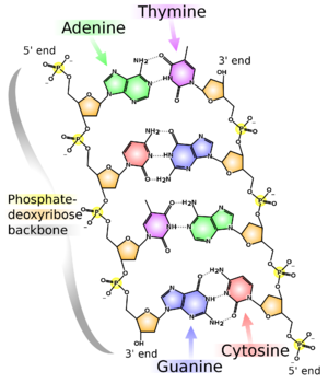 تمثيل تخطيطي لبعض السمات البنيوية للدنا. البني المماثلة للأزواج القاعدية من گوانين:سايتوسين وأدنين:ثايمين موضحة. الأزواج القاعدية تتماسك معاً بواسطة روابط هيدروجينية. الأعمدة الفقرية الفوسفاتية هي مضادة للتوازي.