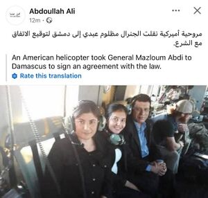 27. ^ "القوات الأمريكية نقلت مظلوم عبدي بطائرة مروحية لتوقيع الأتفاق مع الشرع". عامر هويدي. 2025-03-11. Retrieved 2025-03-12.