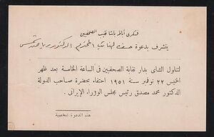 دعوة من فكري اباظة نقيب الصحفيين المصريين في ذالك الزمن لتناول الشاي في نقابة الصحفيين بمناسبة زيارة رئيس وزراء ايران للنقابة سنة 1951