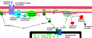 The inositol-phospholipid signaling pathway is responsible for the generation of IP3 through the cleavage of Phosphatidylinositol 4,5-bisphosphate (PIP2) found in the lipid bi-layer of the plasma membrane by phospholipase C in response to either receptor tyrosine kinase or Gq alpha subunit-G protein-coupled receptor signaling. Soluble inositol trisphosphate (IP3) is able to rapidly diffuse into the cytosol and bind to the inositol trisphosphate receptor (InsP3Rs) calcium channels located in the endoplasmic reticulum. This releases calcium into the cytosol, serving as a rapid and potent signal for various cellular processes.[1]