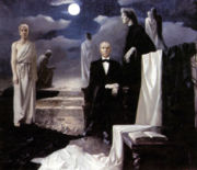 فولند (واقفاً بالأسود) في لوحة للرسام بوغربينسكي تظهر ميخائيل بولغاكوف معه وبيلاطس البنطي.