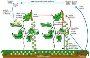 When infecting a caterpillar, the advanced stages of infection cause the host to feed without resting, and then to climb to the higher parts of trees, including exposed places they would normally avoid due to the risk of predators. This is an advantage for the virus if (when the host dissolves) it can drip down onto leaves, which will be consumed by new hosts.[5]