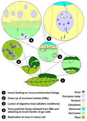 Typically, the initial infection occurs when a susceptible host insect feeds on plants that are contaminated with the occluded form of the virus. The protein matrix dissolves in the alkaline environment of the host midgut (stomach), releasing ODVs that then fuse to the columnar epithelial cell membranes of the host intestine and are taken into the cell in endosomes. Nucleocapsids escape from the endosomes and are transported to nucleus. This step is possibly mediated by actin filaments. Viral transcription and replication occur in the cell nucleus and new BV particles are budded out from the basolateral side to spread the infection systemically. During budding, BV acquires a loosely fitting host cell membrane with expressed and displayed viral glycoproteins.