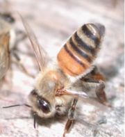 رفرفة أجنحة نحل العسل يكشف غدة ناسونوڤ (بيضاء عند طرف البطن) تطلق الفرمون لإجتذاب سرب إلى عش نحل فارغ
