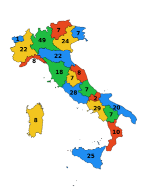 تُعرف باسم: Règions étaliènes (Arpitan), Régions d'Italie (فرنسية), Italienische Regionen (ألمانية), Riggiuni d'Italia (صقلية), Rejon de Itàlia (Venetian) | |