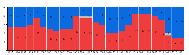 Number of regions governed by each coalition since 1995: