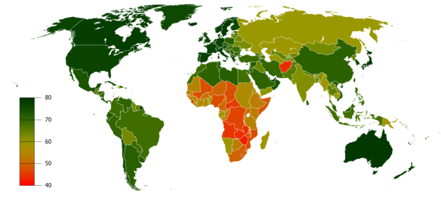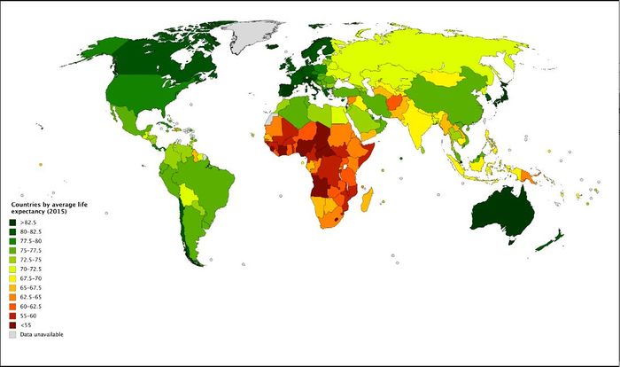 مأمول العمر (من كلا الجنسين، عند الولادة) للفترة 2005-2010 (برنامج الأمم المتحدة WPP 2006) يتراوح ما بين 82.6 سنة في اليابان إلى 39،6 عاما في سوازيلاند. كثير من البلدان عانت انخفاض في مأمول العمر، وهما سوازيلاند وبوتسوانا وليسوتو وزمبابوي وجنوب أفريقيا، ناميبيا، وزامبيا، وملاوي، وجمهورية أفريقيا الوسطى وموزامبيق وغينيا بيساو، ذلك بسبب معانتها من انتشار فيروس نقص المناعه البشرية (الايدز)،وكذلك انتشاره بين البالغين، بنسب تتراوح بين 10 إلى 38،8 في المئة[5]. كما نلاحظ أنه في البلدان التي ترتفع فيها معدلات وفيات الاطفال سيكون مأمول العمر عند الولادة أقل وربما لا تعكس العمر المتوقع للشخص الذي يعيش بعد ذلك.