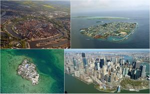 أكثر الجزر المزدحمة في العالم: أعلى اليسار جزيرة لوبك، ألمانيا، أعلى اليمين جزيرة ماله، المالديڤ، أسفل اليسار جزيرة سانتا كروز، كولومبيا، أسفل اليمين جزيرة مانتهاتن، الولايات المتحدة.