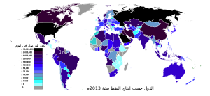 الدول المنتجة للنفط في عام 2013، بمقدار برميل واحد في اليوم (كتاب حقائق العالم).